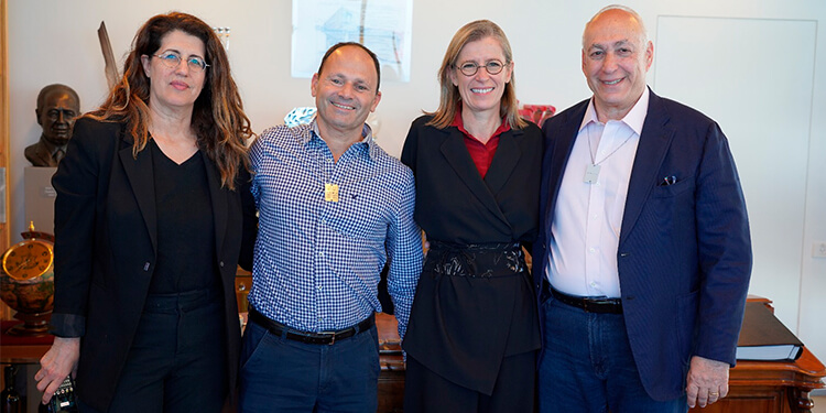 קרדיט צילום: יסמין עדילה. בתמונה מימין לשמאל: יור מרכז פרס לשלום ולחדשנות, חמי פרס, קרין ג׳סטין, מנהלת הקרנות הבינ״ל, אדמונד דה רוטשילד, אלי בוך- מנהל פילנתרופיה- קרן אדמונד דה רוטשילד, ואפרת דובדבני מנכ"לית מרכז פרס לשלום ולחדשנות